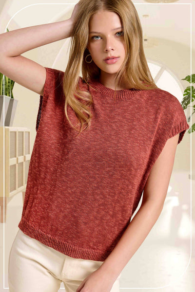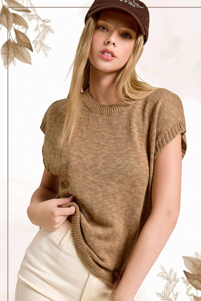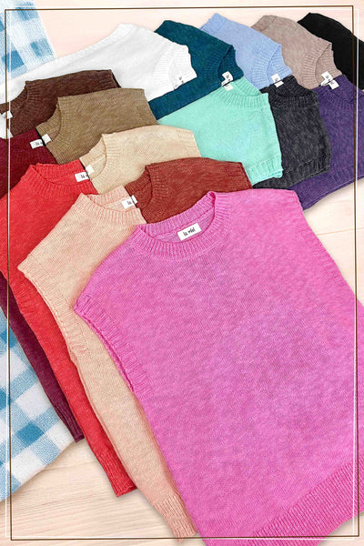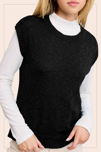 knit top, knit vest, layering piece, ribbed hem detail, sleeveless top, minimal style, loose fit silhouette, crew neckline, solid color top, everyday look