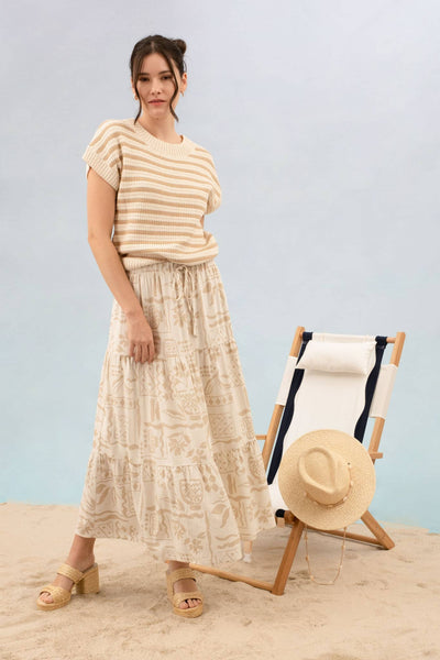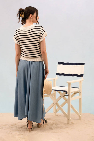 B5ST1039 2 SMALL 2 MEDIUM 2 LARGE CREW NECKLINE SHORT SLEEVES EXTENDED SHOULDER RIBBED DETAIL RELAXED FIT STRIPE PATTERN KNIT PULLOVER SWEATER 100% COTTON